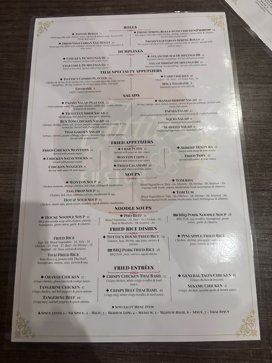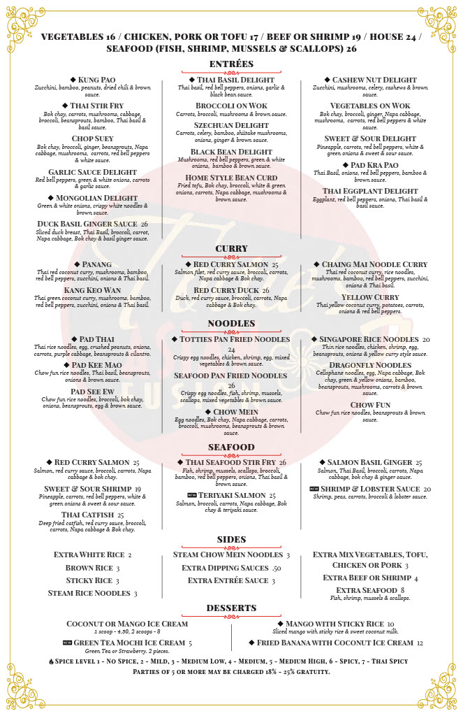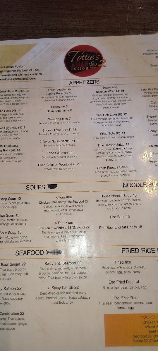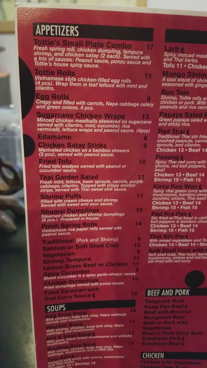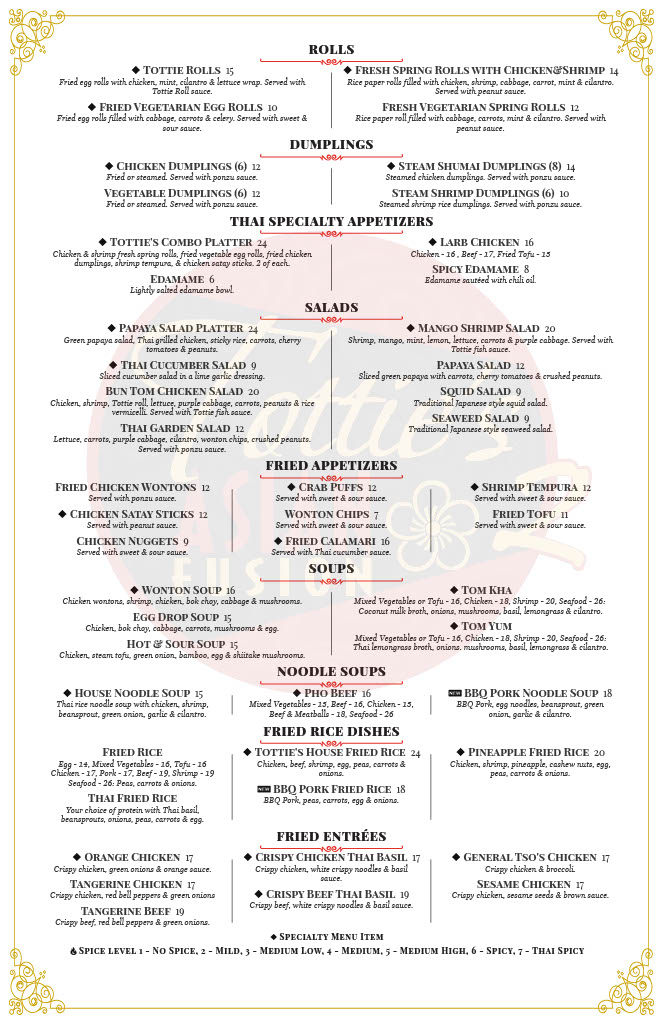 Traditional spring roll, egg roll, chicken dumpling, shrimp tempura, chicken satay. Two of each. Served with Tottie's house sauce.